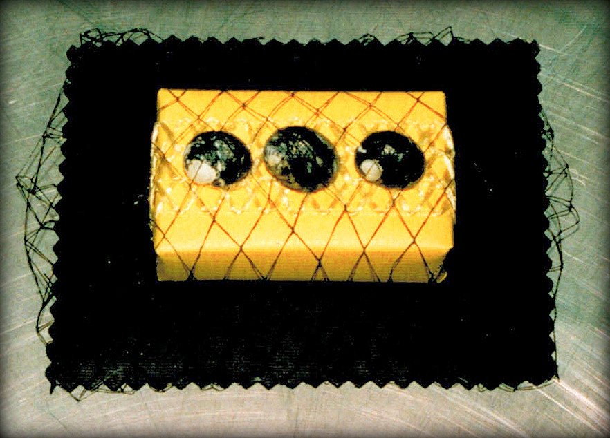 box fixed with vintage tulle on zigzag cutted corrugated cardboard (as tray), raffia ribbon & 3 antique glass buttons PIN BLOG