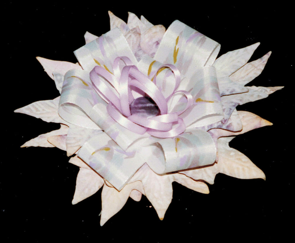 artif.leaves, layers of diff. ribbon loops fixed with button Publiziert 12. Januar 2014 | Von Sabine Kurtz Die gesamte Größe beträgt 1000 × 823 Pixel box under golden & violet wrapped cardboard circles, candle ring PIN BLOG » « artif.flowers under fabric covered cardboard with button