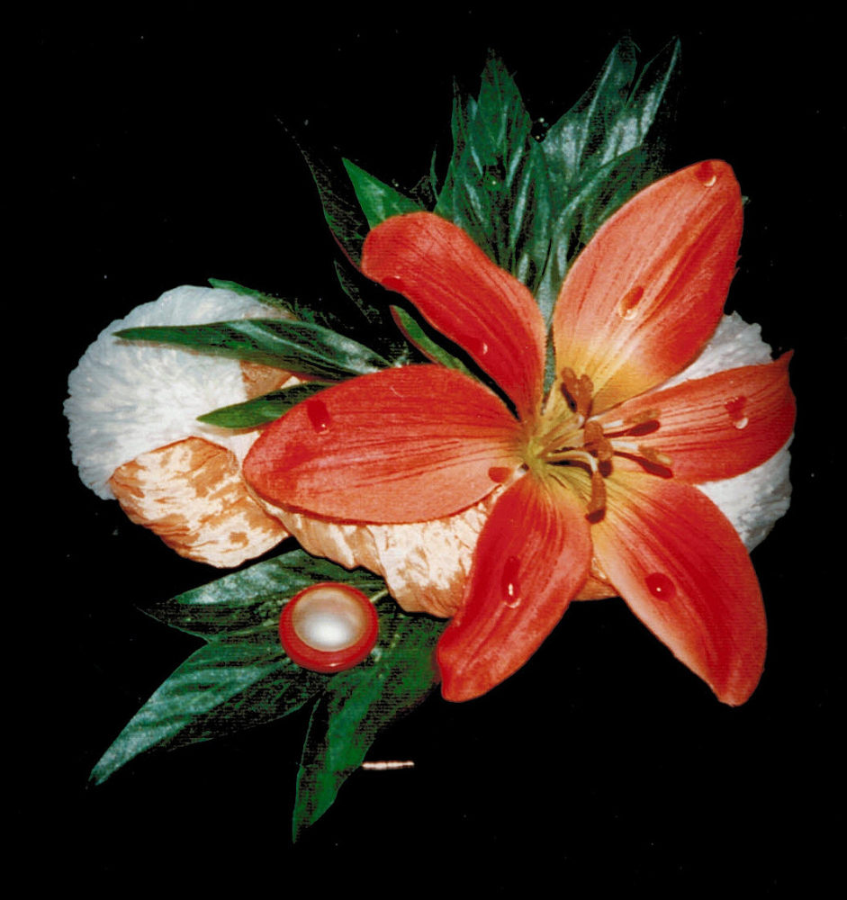 rd.black box under crinkled color shaded chiffon, silk lily with raindrops, antique button