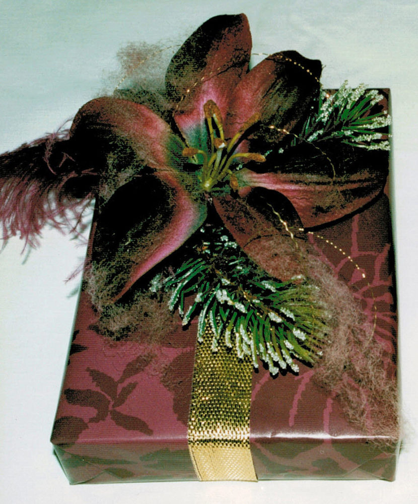 metallic ribbon, large silk lily under spun yarn, `frosted´ fir, crinkled gold wire Publiziert 22. Januar 2014 | Von Sabine Kurtz Die gesamte Größe beträgt 830 × 1000 Pixel patterned lace, artif.flower, organza bow » « DIY tassels of blue raffia, lila satin bow with ranunkulus, pearl, diff.satin ribbons
