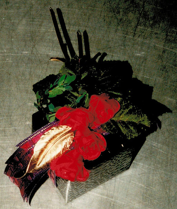 red & violet ribbon, artif.roses & leaves, centerpiece a former gold.earring Publiziert 26. Januar 2014 | Von Sabine Kurtz Die gesamte Größe beträgt 596 × 705 Pixel « black box, silk poppies under burlap ribbon & rhinestone