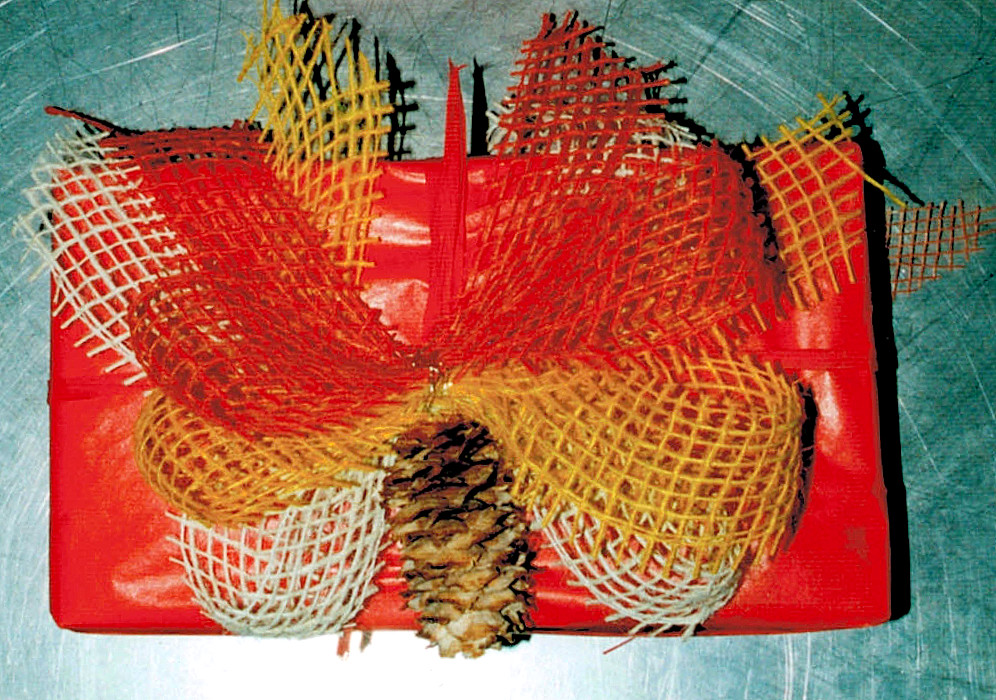 shaped burlap bow with satin strings & pine cone Publiziert 29. Januar 2014 | Von Sabine Kurtz Die gesamte Größe beträgt 996 × 700 Pixel metallic paper, satin ribbon, silk orchid, organza loops » « large flat pressed artif.poinsetta, frosted berries & loops of crinkled gold.wire
